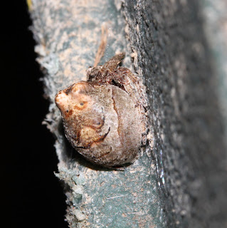 A couple of days later we put on our headlamps and did a night op looking for spiders. I have reported before in this blog that on an earlier operation I found a small colony of Scytodes spitting spiders living in the siding of one corner of our house, and coming out at night to hunt. This is a frail, slow-moving, and, I imagine, rather timid spider that has perfected a hands-off method of hunting. They walk up close (but not too close) to a suitable small insect, point their fangs forward and they spit a mixture of glue and venom at it. They shiver their fangs, making a criss-crossing stream that envelopes their prey. By the time the prey begins to think it is in danger, it is already pinned to the ground with the venom sinking in.